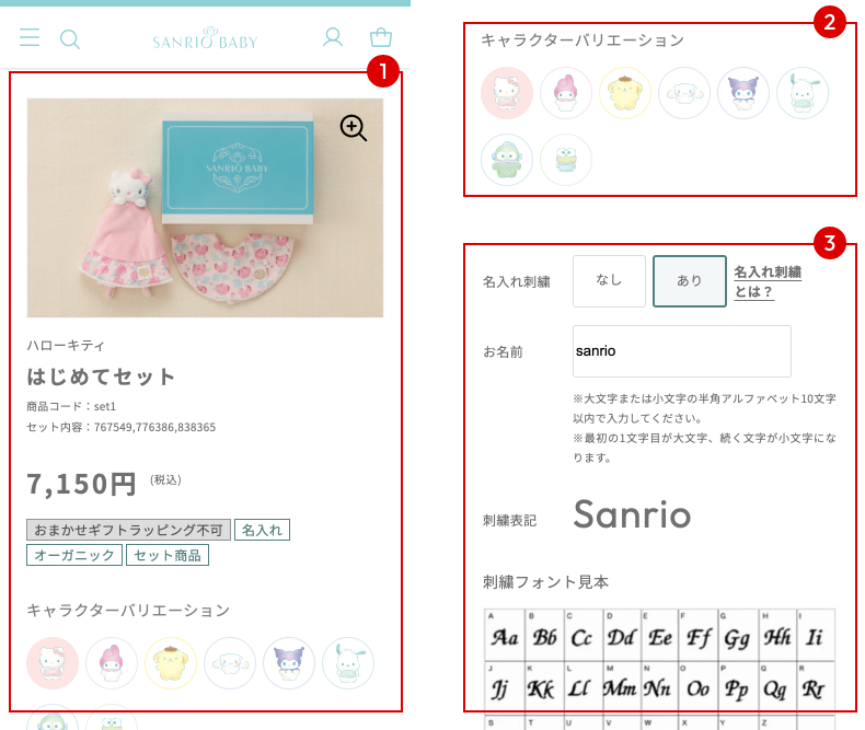 名入れ刺繍を行う場合、名入れ刺繍「あり」を選択します。その後「お名前」「刺繍糸の色」「名入れする商品」(セット商品の場合)項目の入力を行います。