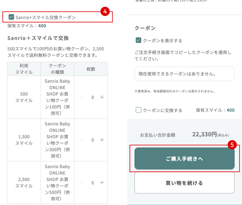 Sanrio+スマイルクーポンを取得する際は、カート画面の「Sanrio+スマイルを利用して交換する」にチェックを入れてください。クーポンの種類と枚数を選択し「交換する」を押してください。
